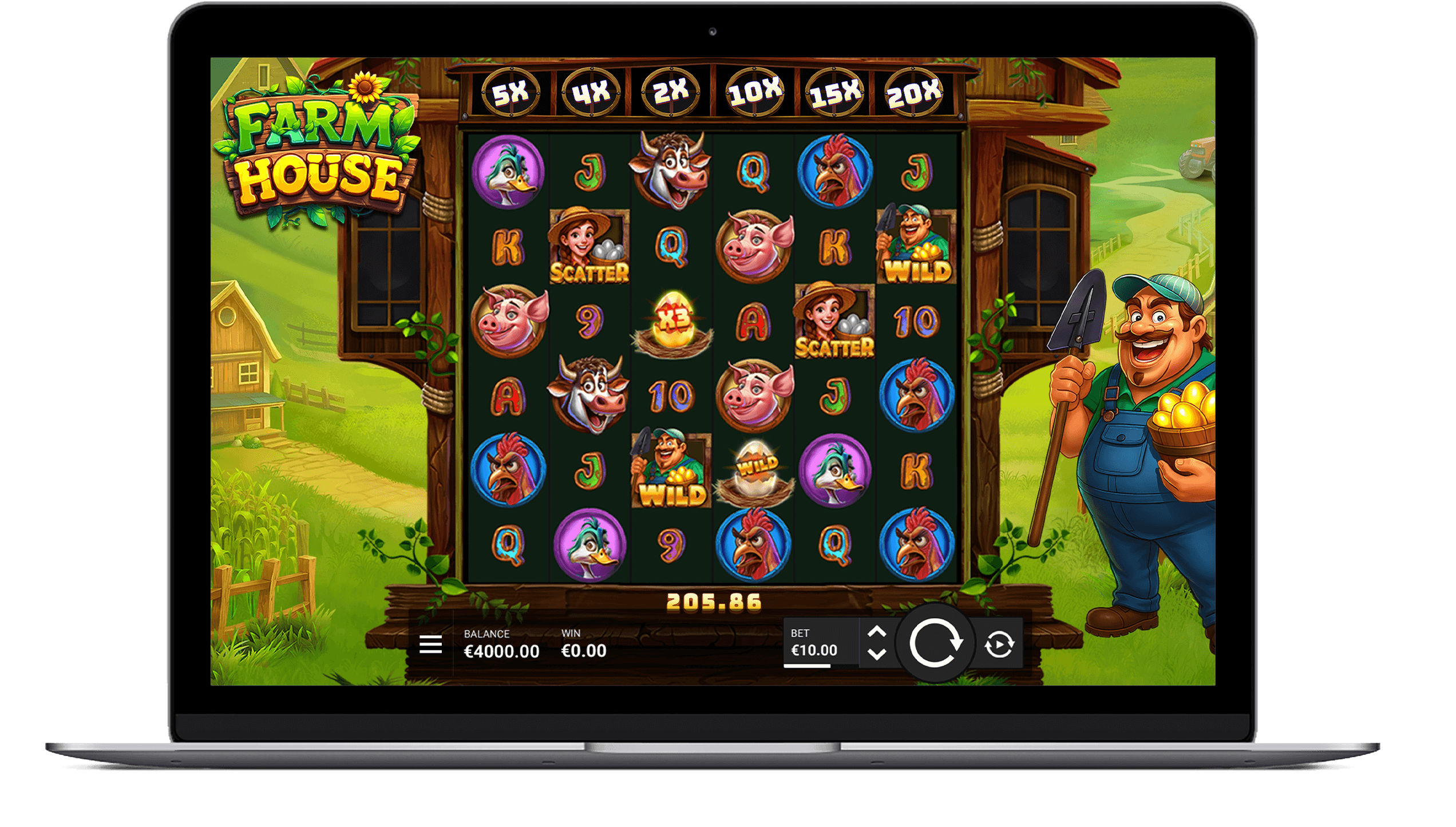 Welcome to Farmhouse, a 6-reel, 6-row cluster wins slot game set on a bustling, whimsical farm where chaos runs wild. Wild symbols transform and spread to nearby symbols, Silver Eggs crack open to upgrade low-value symbols into Wild, and Golden Eggs unleash the Boost Feature, supercharging the reels with additive and multiplicative multipliers of up to 500x. With cascading wins and a thrilling Free Range Bonus game, this countryside caper is anything but calm!